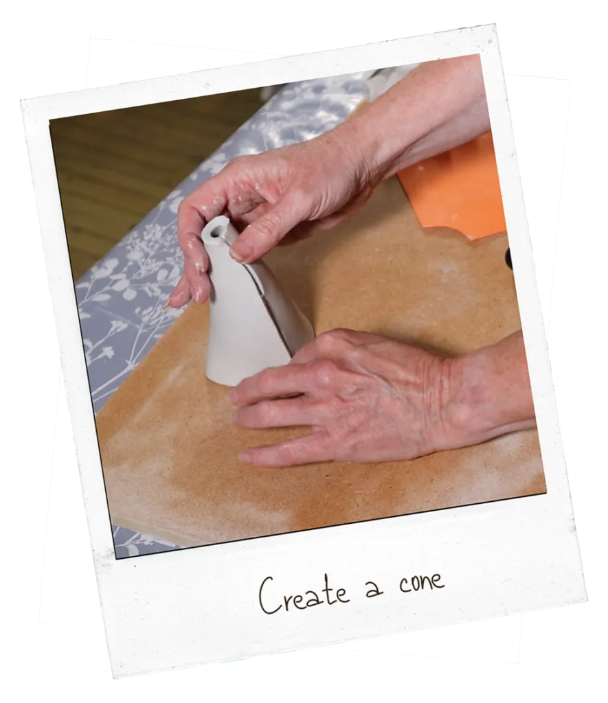 Pick the sheet up and wrap it round to create a cone shape, the template will give you a large bottom and a smaller top. Press the two sides together and smooth one side over the other, so they join.