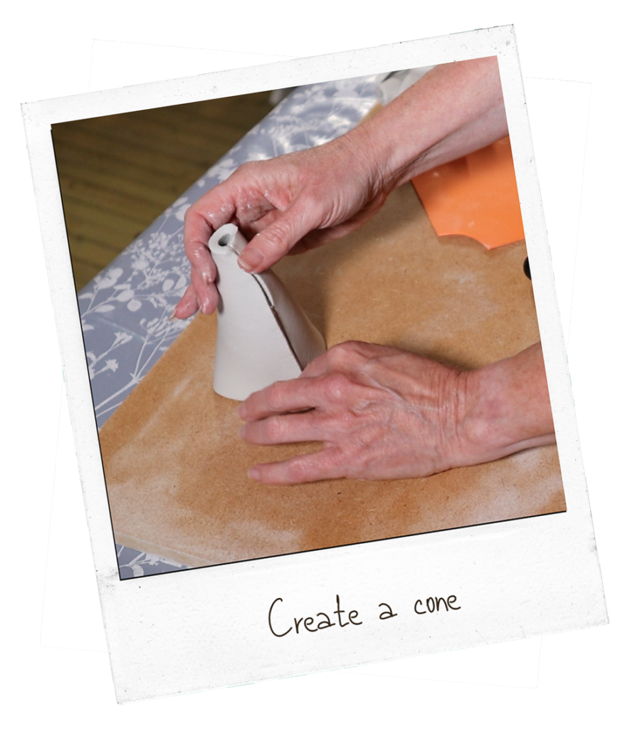 Pick the sheet up and wrap it round to create a cone shape, the template will give you a large bottom and a smaller top. Press the two sides together and smooth one side over the other, so they join.